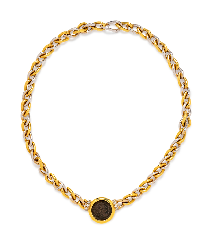 An 18 Karat Bicolor Gold, Ancient Roman Coin and Diamond Necklace, Italian,