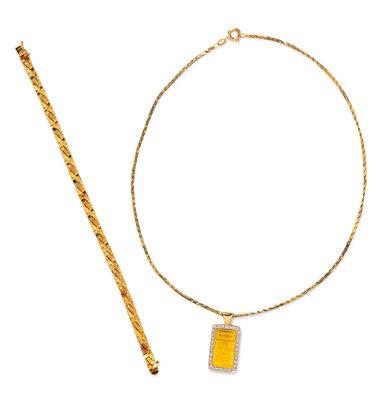 consisting of a textured gold link bracelet, together with a pendant necklace containing one five gram gold bullion bar surrounded by 32 single cut diamonds weighing approximately 0.10 carat total, suspended from a flat serpentine chain necklace.