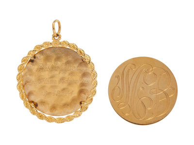 consisting of a monogram engraved brooch, together with a monogram engraved pendant with twisted wire surround.