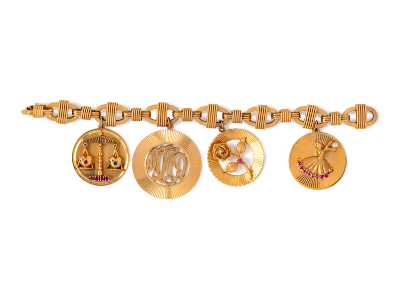 consisting of a fancy link bracelet suspending an I LOVE YOU scale charm with five rubies and one sapphire, a pierced monogram disc charm, a round charm with a rose containing one diamond and one ruby and a disc charm surmounted with a ballerina containing one pearl and nine rubies.