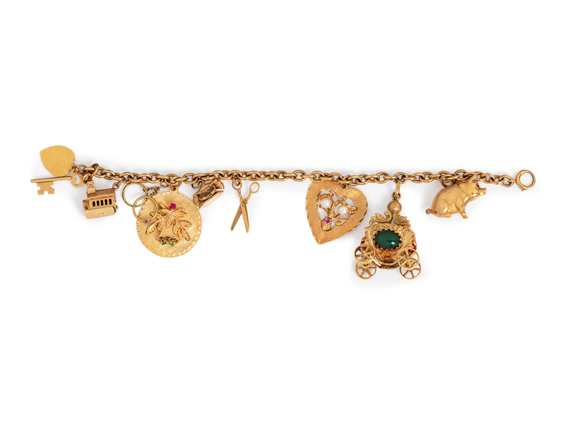 consisting of a cable link bracelet suspending nine charms including a pig charm with ruby eyes, an Italian 14 karat multigem carriage charm, a 14 karat heart charm with two pearls and a ruby, a scissor charm, a telephone charm, a 14 karat disc charm surmounted with a bell and holly and three gemstones, a 14 karat ring set charm with one diamond, a 14 karat church charm and a 14 karat key and heart charm.
