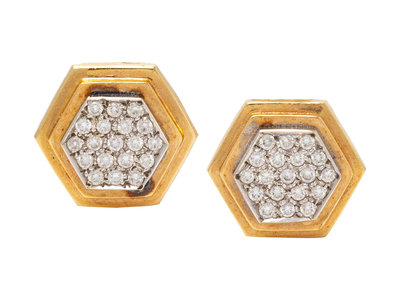 A Pair of 14 Karat Yellow Gold and Diamond Earclips,