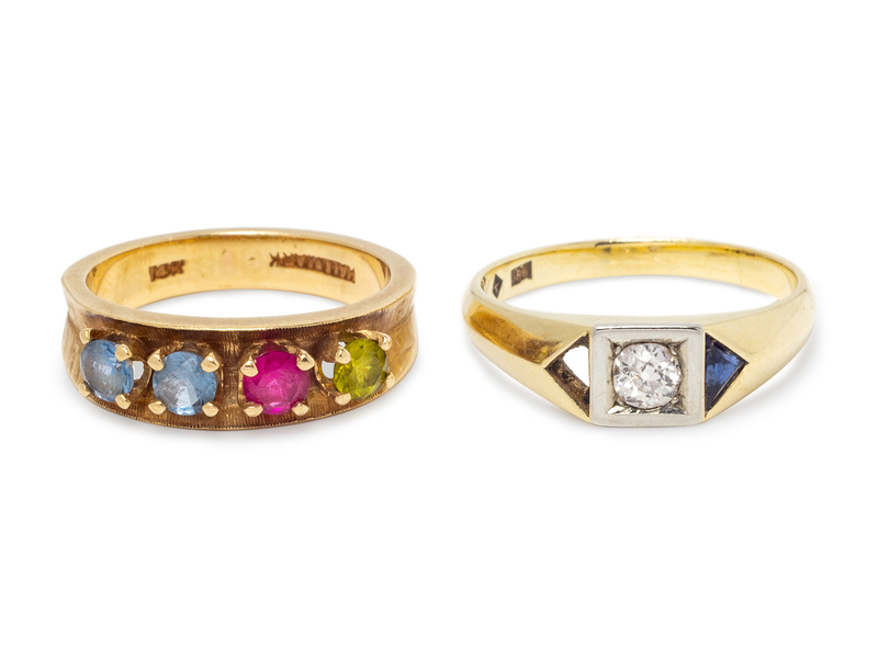 consisting of a ring containing one old mine cut diamond weighing approximately 0.25 carat and one triangular cut synthetic sapphire, together with a ring containing two blue topaz, one ruby, and one peridot.