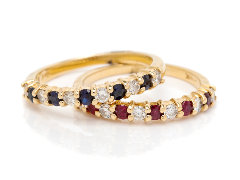 consisting of two rings containing 12 round brilliant cut diamonds weighing approximately 0.40 carat total and five round sapphires and five round rubies.