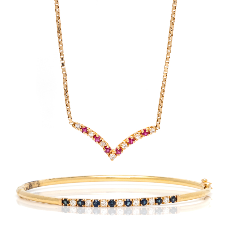 A Collection of 14 Karat Yellow Gold, Diamond, Sapphire and Ruby Jewelry,