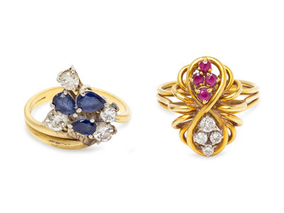 consisting of a ring containing three pear shape sapphires and four round brilliant cut diamonds weighing approximately 0.55 carat total, together with a ring containing four round rubies and four round brilliant cut diamonds weighing approximately 0.14 carat total.
