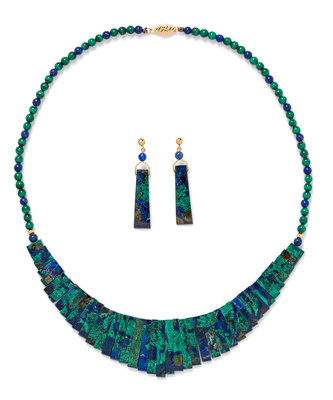 consisting of a graduated bead necklace and a pair of earrings containing two lapis lazuli round beads and azure malachite drops.