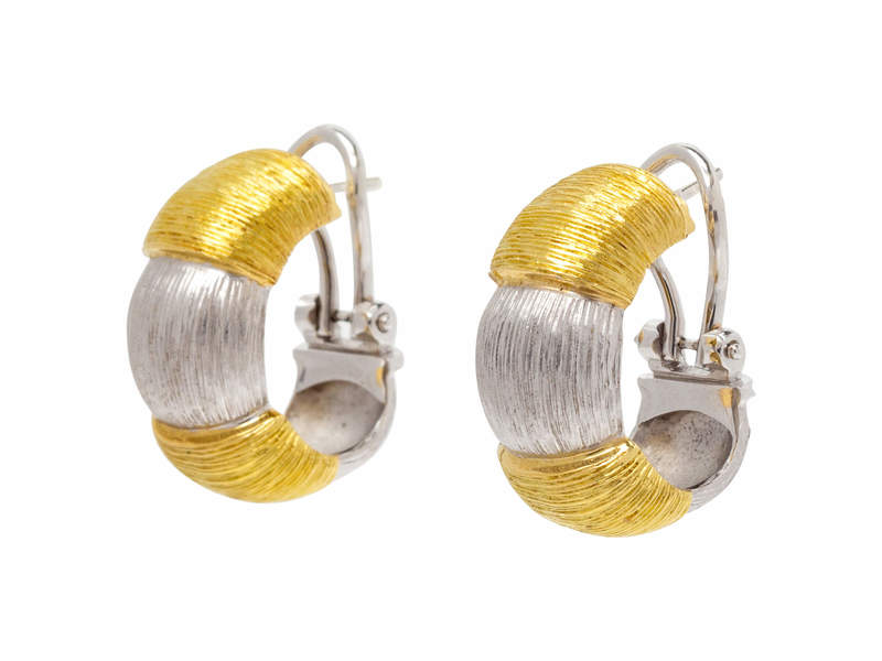 with alternating white and yellow gold sections in a brushed finish, posts with clip backs.