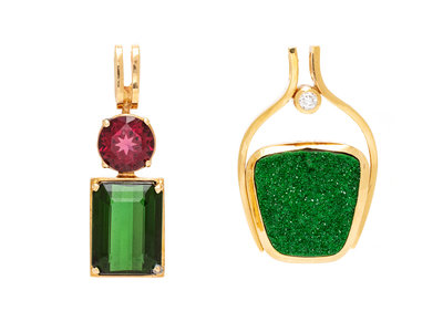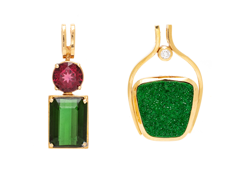 consisting of a pendant containing one octagonal step cut tourmaline measuring approximately 11.80 x 8.80 x 4.65 mm and one round pink tourmaline measuring approximately 7.00 mm in diameter, together with an 18 karat gold pendant containing one round brilliant cut diamond and one dyed green druzy quartz.