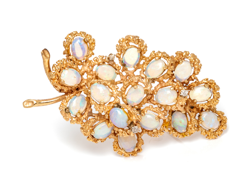 designed as a cluster of grapes, containing 17 oval shape cabochon cut opals measuring approximately 5.50 x 7.00 mm and three round brilliant cut diamonds weighing approximately 0.10 carat total.