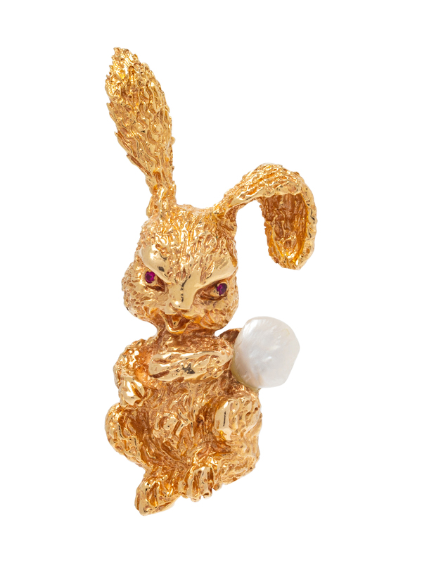 consisting of a textured gold rabbit with one Baroque pearl measuring approximately 7.60 x 6.30 mm and two ruby eyes.