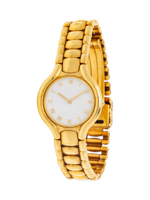 23.00 mm case diameter, white dial signed EBEL, applied gold Roman numerals, gold obelisque hands, case back affixed by four screws, quartz movement, link bracelet, deployant clasp.