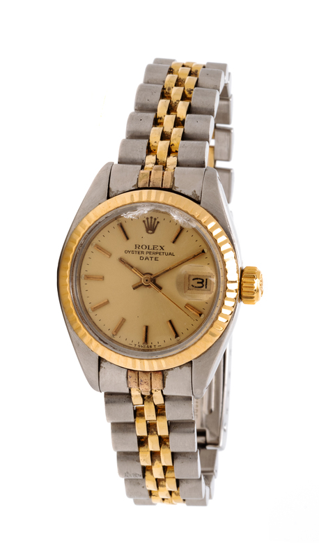 26.00 mm case diameter, matte gold dial signed ROLEX, applied gold baton numerals, gold baton hands with center sweep seconds hand, date aperture at 3 o'clock with magnifying window in crystal, fluted gold bezel, brushed and polished steel tonneau case, screw down coin edge gold crown, screw down case back, self-winding movement, steel and gold Jubilee link bracelet, deployant clasp signed ROLEX.