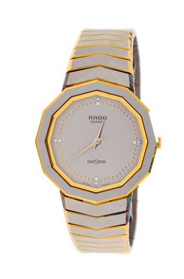 32.00 mm case diameter, matte silvered dial signed RADO, single cut diamond numeral markers at 3, 6, 9 and 12 o'clock, gold pitched dauphine hands, quartz movement, brushed steel and yellow gold flexible link bracelet, double deployant clasp.