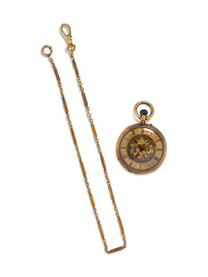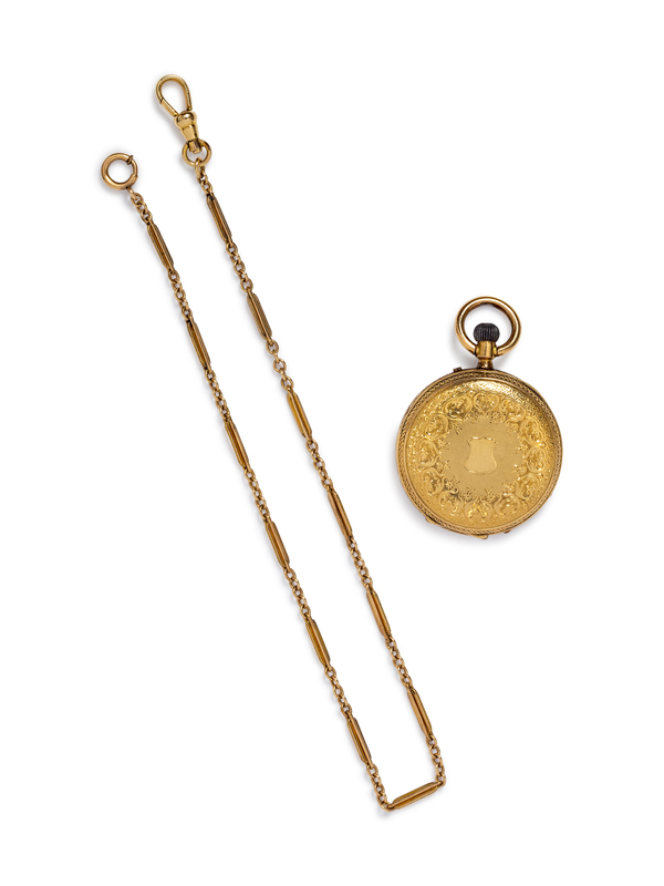 A 18 Karat Yellow Gold Open Face Pocket Watch and Yellow Gold Fob Chain,