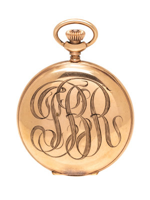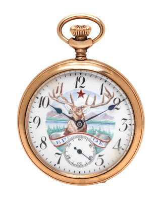 48.00 mm case diameter, white single-sunk dial painted with the Benevolent and Protective Order of Elks symbol, black Arabic numerals, blued steel spade hands, subdial for seconds at 6 o'clock, polished bezel, monogrammed case back, stem wound and set 7 jewel movement signed NEW ENGLAND WATCH Co. ALDEN.