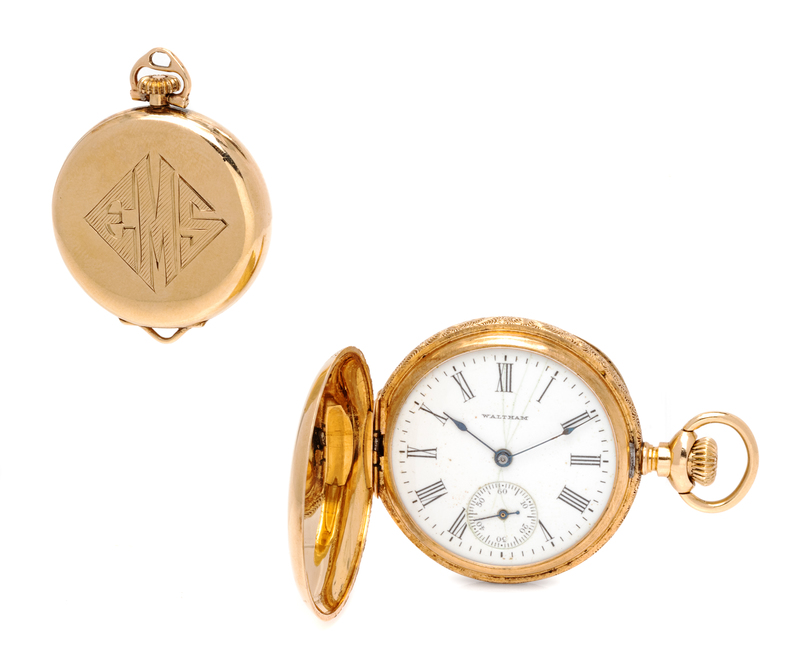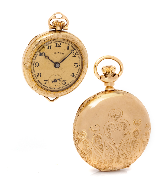 consisting of a 14 karat gold hunter case pocket watch with 30.00 mm case diameter, white dial signed WALTHAM, black Roman numerals, blued steel spade hands, subdial for seconds at 6 o'clock, engraved case and bezel, stem wound and set 15 jewel movement signed WALTHAM, together with an open face pocket watch with 27.00 mm case diameter, matte gold dial signed ILLINOIS, black Arabic numerals, blued steel Breguet hands, subdial for seconds at 6 o'clock, monogram engraved case back, stem wound and set 15 jewel movement signed ILLINOIS WATCH CO.
