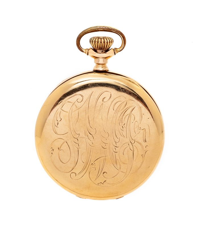 42.00 mm case diameter, white single-sunk dial signed ELGIN, black Arabic numerals, blued steel Poire Stuart hands, subdial for seconds at 6 o'clock, personalized cuvette, polished case with monogrammed case back, stem wound and set 15 jewel nickel movement signed ELGIN WATCH CO U.S.A.