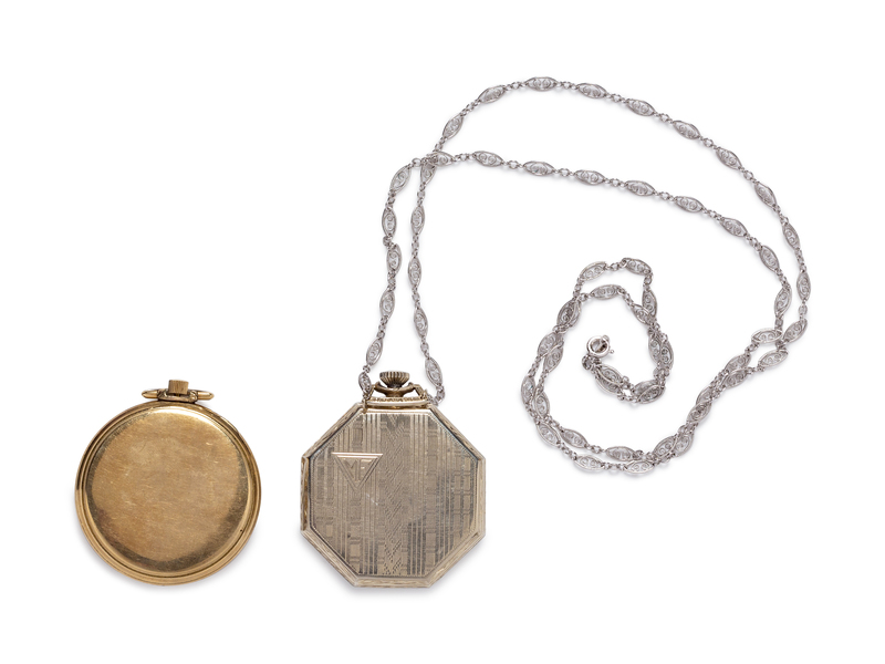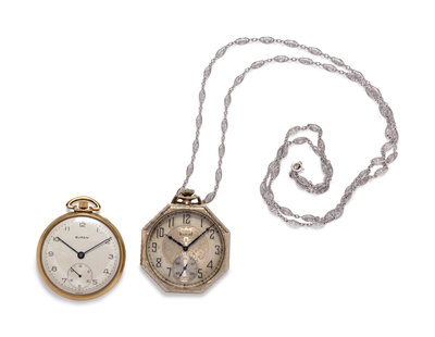 consisting of a white gold pocket watch with 42.00 mm case diameter, off white and silver tone dial signed ELGIN, black Arabic numerals, blued steel losanges hands, 17 jewel movement signed ELGIN NAT'L WATCH CO., engraved case, suspended from a base metal fancy link necklace, together with an open face gold filled pocket watch with 42.00 mm case diameter, matte silvered dial signed BUREN, black Arabic numerals, blued steel baton hands, subdial for seconds at 6 o'clock, 17 jewel movement signed BUREN WATCH Co S.A.
