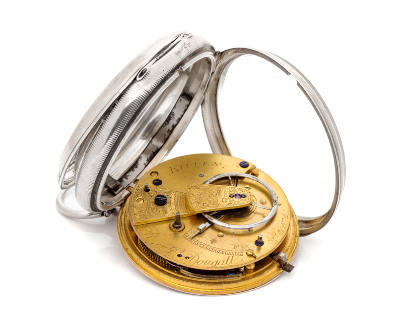 49.00 mm case diameter, intricately chased single-sunk dial with central floral motif, applied gold Roman numerals, blued steel Poire Stuart hands, subdial for seconds at 6 o'clock, polished bezel, engraved case back with blank cartouche, hinged swing out verge movement, gilt verge chain fusee movement with cylindrical pillars, signed KIPPEN R&J. Dougall No. 30474, engraved balance cock, dust cover, floral motif engraved bezel and case.