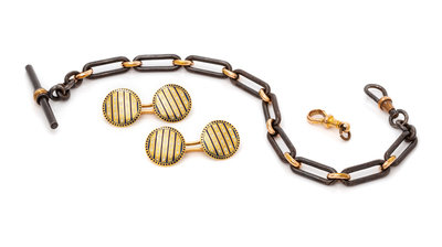 consisting of a stainless steel and yellow gold watch chain and pair of French 18 karat yellow gold cufflinks with blue and white enamel detail.