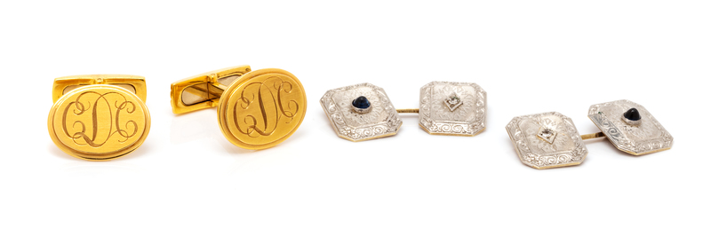containing one pair of Italian 18 karat yellow gold monogram engraved cufflinks and a pair of platinum topped gold cufflinks containing two round cabochon cut sapphires and two old mine cut diamonds.