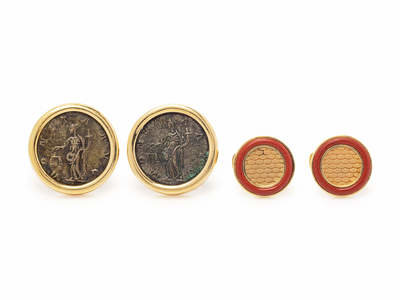 consisting of a pair of cufflinks containing two ancient Roman silver Denarius coins, together with a pair of cufflinks with patterned gold and carved carnelian surround.