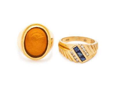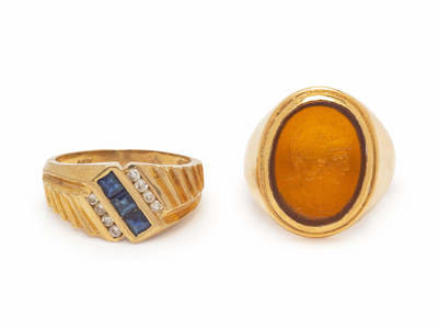 consisting of a 14 karat ring containing three square step cut sapphires and eight round brilliant cut diamonds weighing approximately 0.08 carat total, together with a signet ring containing an oval shape carved sard depicting the profile of a warrior.