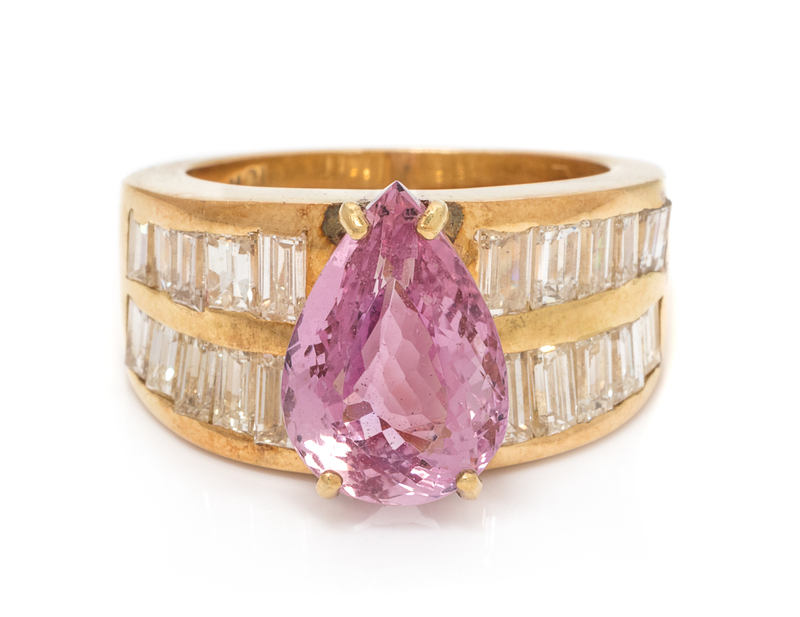 containing one pear shape pink topaz measuring approximately 12.73 x 8.64 x 6.45 mm and 20 baguette cut diamonds weighing approximately 1.20 carats total.