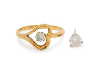 consisting of a 14 karat yellow gold heart shaped ring containing one round brilliant cut diamond weighing approximately 0.15 carat, together with a single white gold stud earring containing one round brilliant cut diamond weighing approximately 0.35 carat.