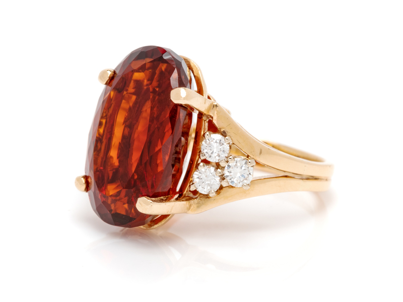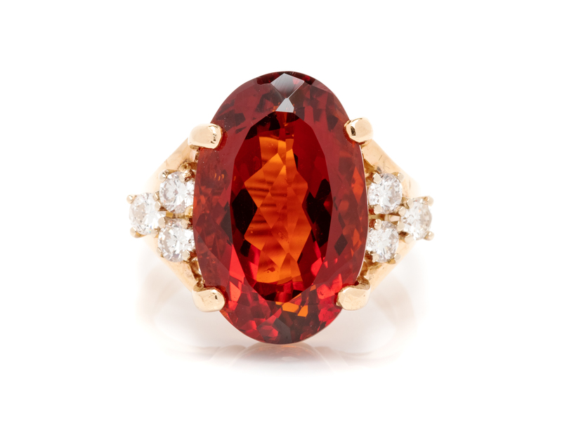 containing one oval mixed cut reddish orange quartz measuring approximately 18.00 x 11.50 x 8.85 mm and six diamonds weighing approximately 0.50 carat total.