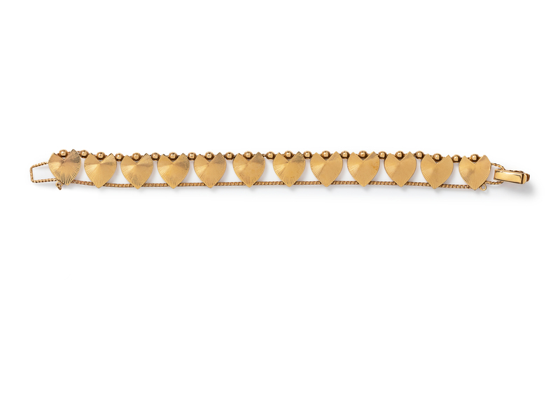 consisting of a bracelet containing 12 heart beads with gold bead spacers and an interlinking chain at the bottom of the hearts, together with a pair of earclips with heart charms and screwback clipbacks.