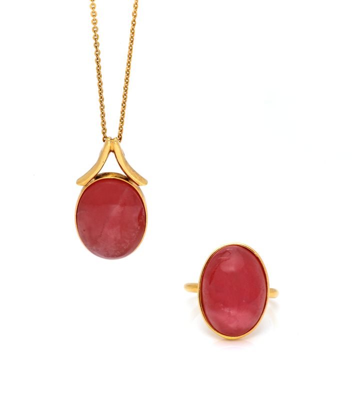 consisting of a pendant containing one oval cabochon cut pink tourmaline measuring approximately 17.90 x 13.25 mm suspended from a cable link chain, together with a ring containing one oval cabochon cut pink tourmaline measuring approximately 17.75 x 12.70 mm.
