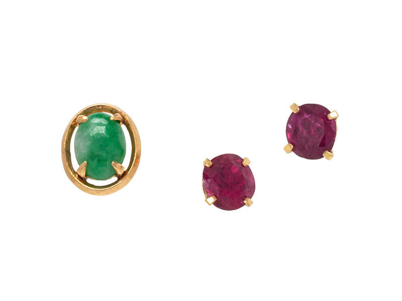 consisting of a pair of stud earrings containing two oval shape mixed cut synthetic rubies measuring approximately 5.45 x 5.00 mm, together with a 14 karat yellow gold single stud earring containing one oval shape jade measuring approximately 6.95 x 5.10 mm.