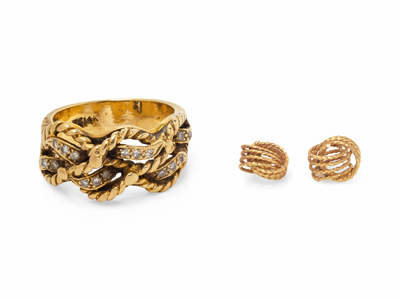 consisting of a ring containing 16 single cut diamonds weighing approximately 0.08 carat total and a pair of 14 karat knot motif stud earrings.