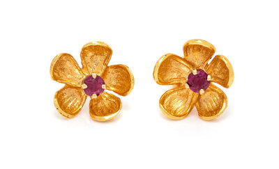 A Pair of Yellow Gold and Ruby Flower Motif Earrings,