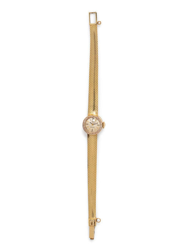 14.00 mm in diameter case dimensions, gold matte face signed OMEGA, applied gold and black baton numerals, black pencil hands, manual wind movement, snap on case back, gold woven mesh bracelet, fold over clasp with Omega symbol.