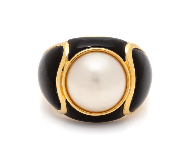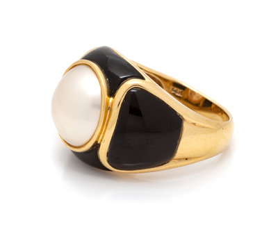 A 14 Karat Yellow Gold, Cultured Mabe Pearl and Enamel Ring,