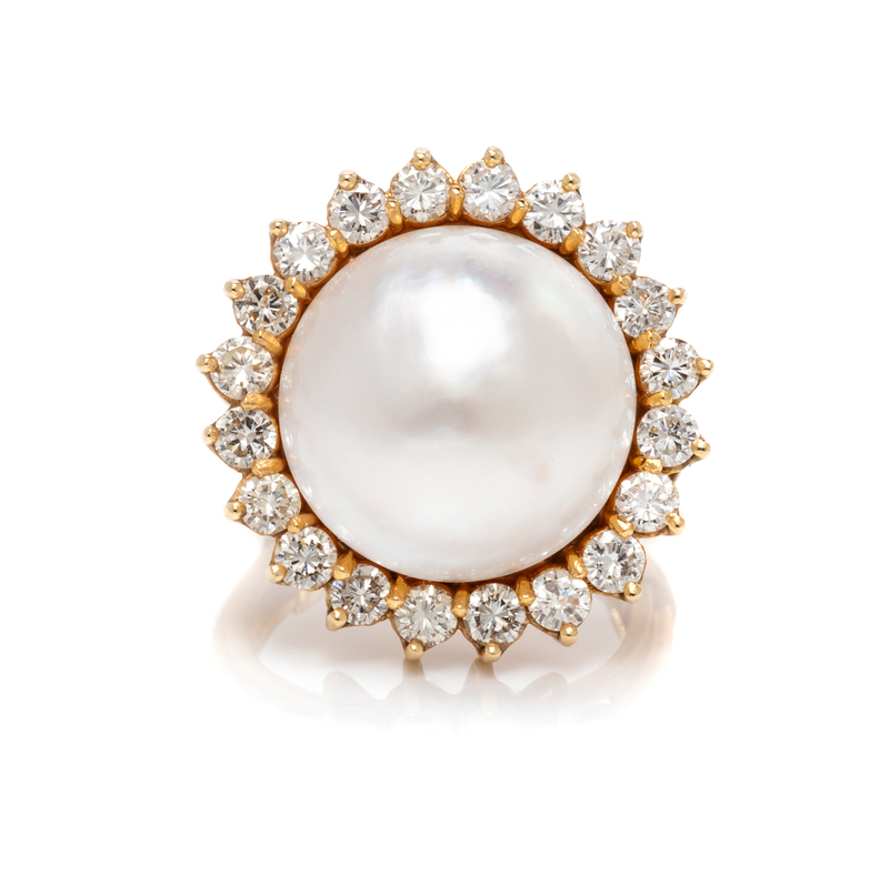 containing one mabe pearl measuring approximately 15.10 mm in diameter and 20 round brilliant cut diamonds weighing approximately 1.40 carats total.