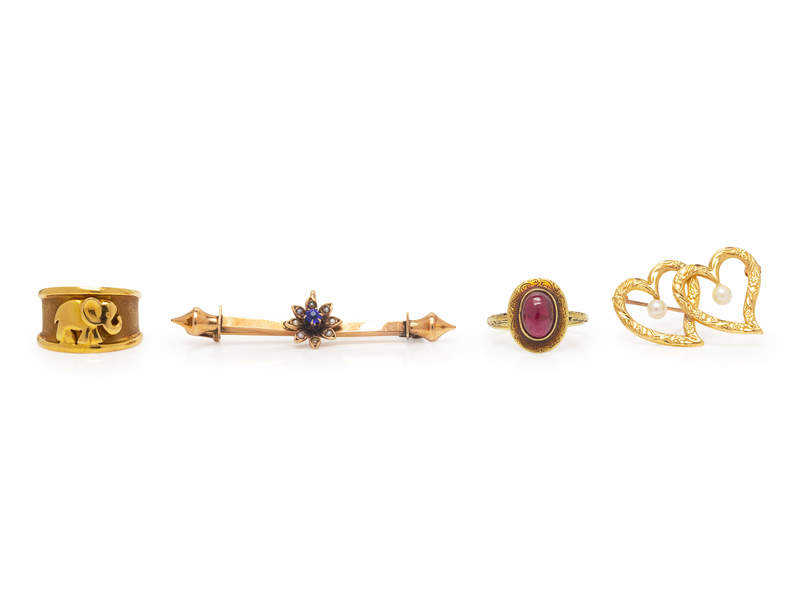 consisting of an 18 karat elephant ring, a 14 karat ring by Baskin Brothers containing one oval shape cabochon cut garnet, a 14 karat heart motif brooch containing two cultured pearls, together with a rose gold bar pendant/brooch containing one round mixed cut synthetic sapphire and seven seed pearls (origin not tested).