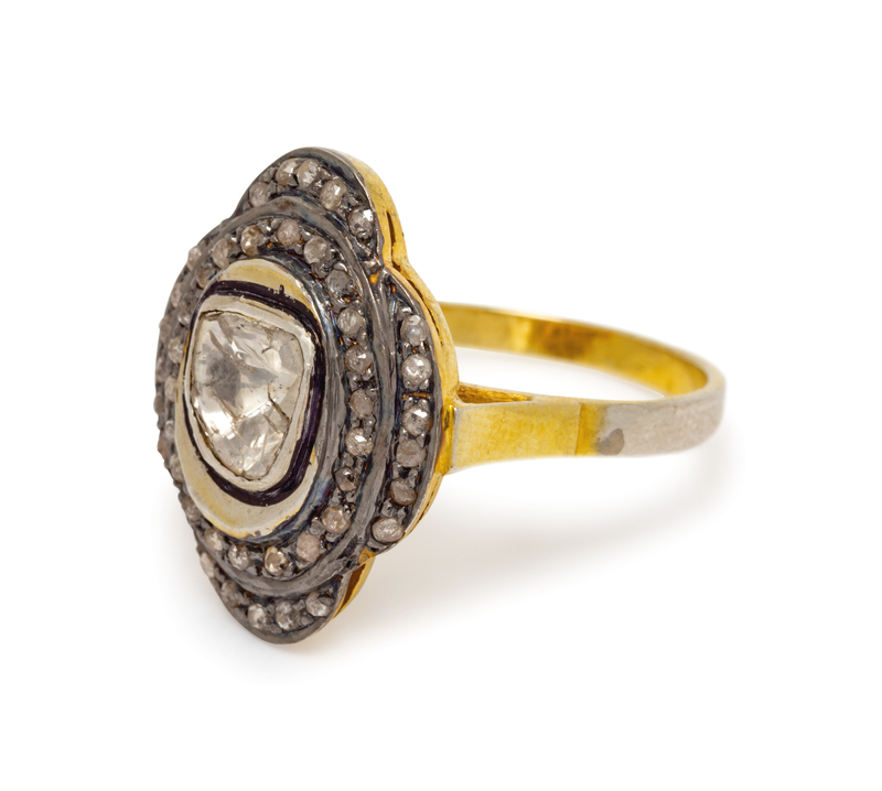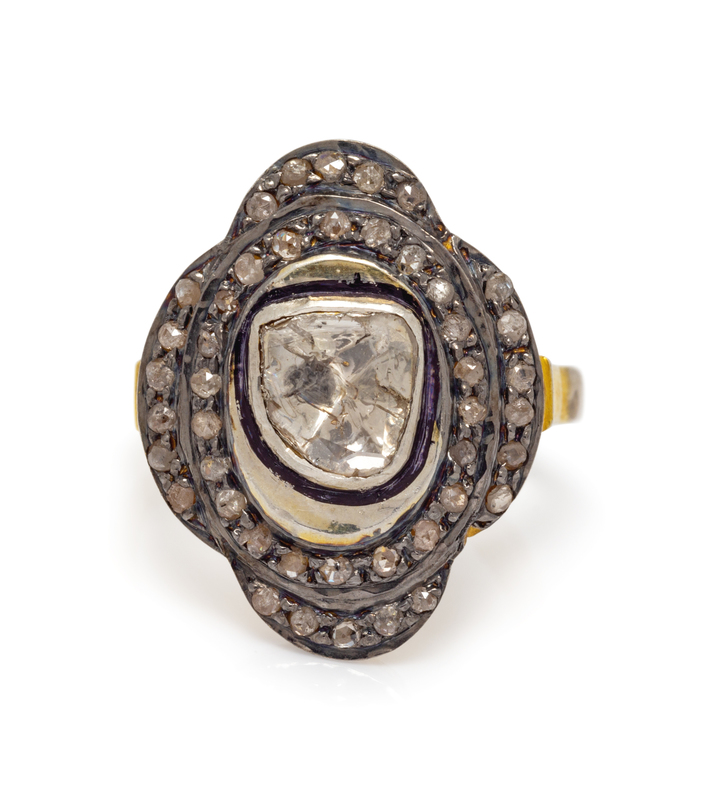 containing one polki cut diamond measuring approximately 6.50 x 6.35 mm and 44 rose and mixed cut diamonds.
