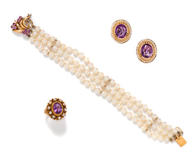consisting of a triple strand bracelet containing 80 pearls measuring approximately 5.35 mm in diameter and nine round mixed cut pink sapphires measuring approximately 2.80 mm in diameter, a ring containing one oval shape mixed cut amethyst measuring approximately 10.50 x 7.75 x 5.25 mm and 10 seed pearls measuring approximately 2.40 mm in diameter, together with a pair of earclips containing two oval shape mixed cut amethyst measuring approximately 12.10 x 10.00 x 5.20 mm and numerous seed pearls.