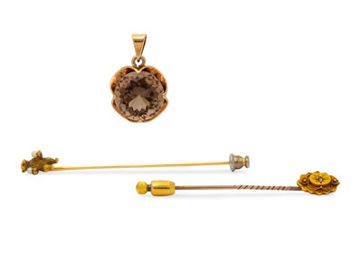 consisting of a stick pin with juggling bear with two pearls (origin not tested), a 15 karat gold Etruscan revival stick pin containing one mixed cut diamond, together with a 14 karat rose gold pendant containing one round mixed cut smoky topaz measuring approximately 13.70 mm in diameter.