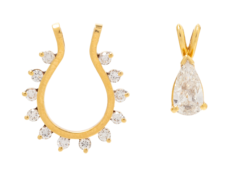 consisting of a pendant containing one pear shaped diamond weighing approximately 0.80 carat and a jacket pendant containing 12 round brilliant cut diamonds weighing approximately 0.40 carat total.