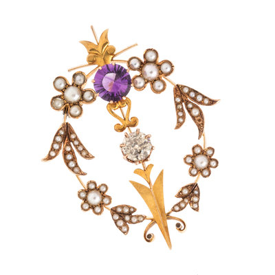 An Antique Yellow Gold, Diamond, Amethyst and Seed Pearl Brooch,