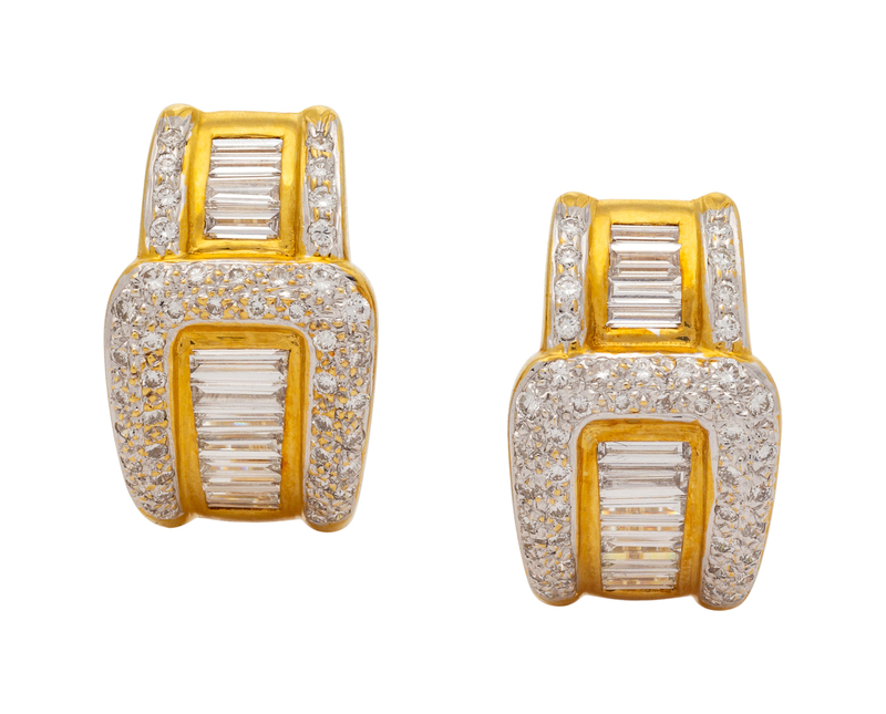 containing 24 baguette cut diamonds weighing approximately 1.50 carats total and 90 round brilliant cut diamonds weighing approximately 0.35 carat total, folding posts with clip backs.