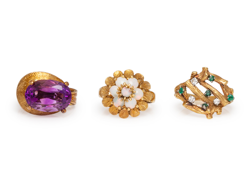 consisting of a ring containing one oval mixed cut amethyst measuring approximately 15.30 x 10.60 mm, a ring containing seven round cabochon cut opals in a floral design, and a ring containing five emeralds and three round brilliant cut diamonds.