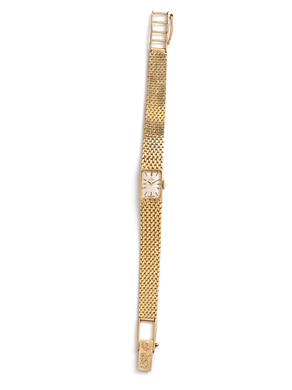 19.00 x 11.00 mm case dimensions, matte silvered dial signed OMEGA, applied black baton hands, black obelisque hands, snap on case back, 17 jewel movement signed OMEGA, textured woven mesh link bracelet, fold over clasp.