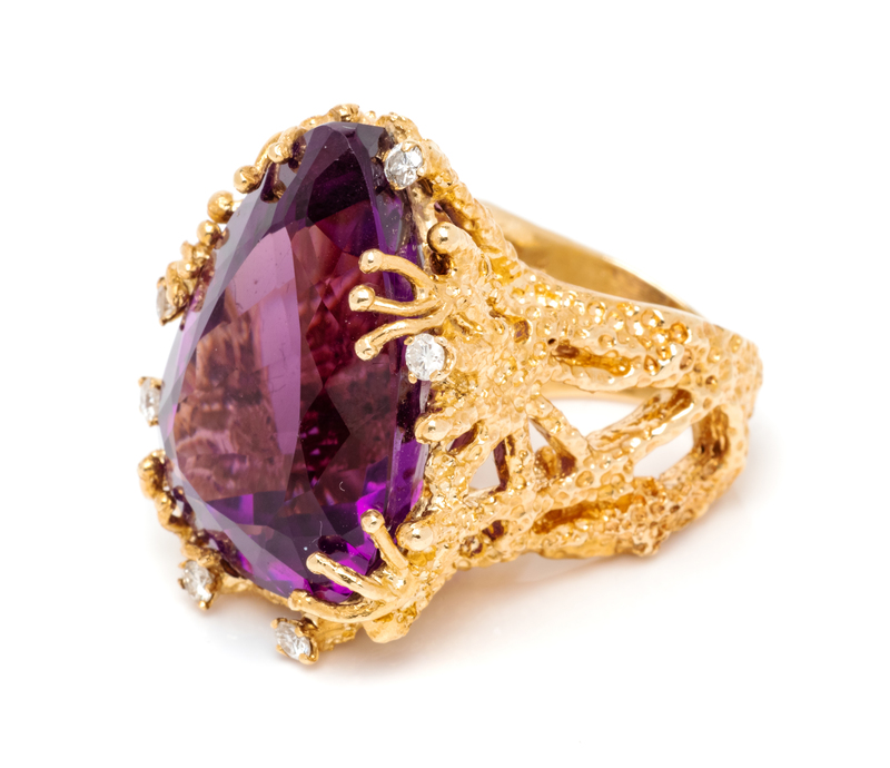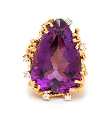 containing one pear shape amethyst measuring approximately 29.00 x 18.65 x 14.45 mm and six round brilliant cut diamonds weighing approximately 0.30 carat total.