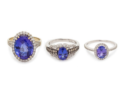 consisting of an 18 karat ring containing one oval shape tanzanite and 52 round brilliant cut diamonds weighing approximately 0.40 carat total, a 14 karat ring by Levian containing one oval shape tanzanite and 48 brilliant cut diamonds and colored diamonds (origin of color not tested) weighing approximately 0.25 carat total, together with a 14 karat ring containing one oval shape tanzanite and 48 round brilliant cut diamonds weighing approximately 0.15 carat total.